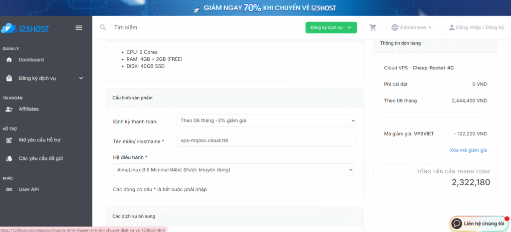 Đầu tiên, bạn hãy truy cập vào trang chủ của 123host và tìm đến dịch vụ mà bạn cần, ví dụ như Hosting, VPS, hoặc Server.