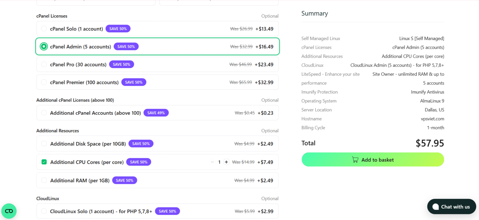 - Tính năng nổi bật: Cho phép tạo và quản lý nhiều tài khoản Hosting riêng cho khách hàng, hỗ trợ WHMCS miễn phí, máy chủ SSD/NVMe tốc độ cao và cPanel/WHM để quản trị dễ dàng.