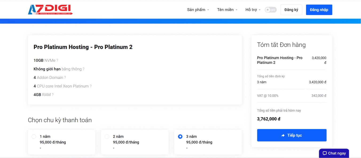 Đầu tiên, bạn hãy truy cập vào trang web chính thức của AZDIGI. Dành thời gian xem qua các dịch vụ để chọn đúng loại bạn cần, ví dụ như Pro Platinum Hosting hay Turbo Business Hosting mà tôi đã phân tích ở trên.