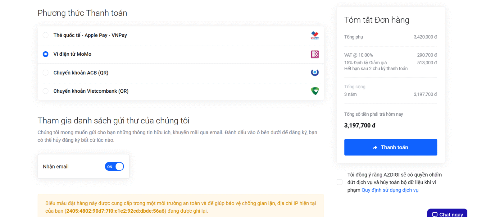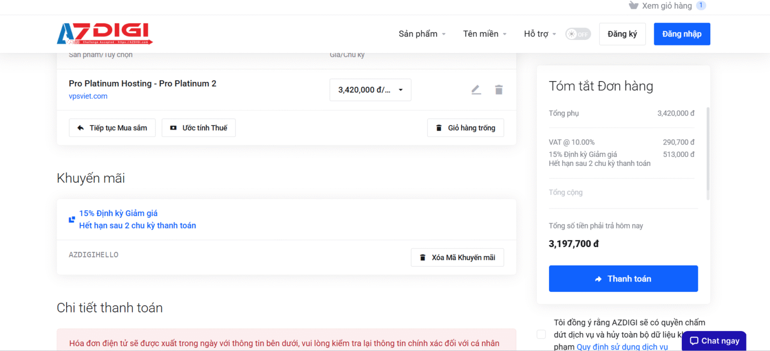 Quá trình áp dụng mã giảm giá của AZDIGI rất đơn giản. Để bạn không gặp phải lỗi nào và tận dụng được tối đa ưu đãi, tôi sẽ hướng dẫn chi tiết từng bước mà tôi thường làm khi đăng ký dịch vụ cho khách hàng của mình.