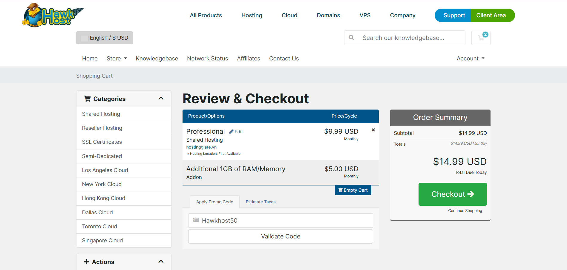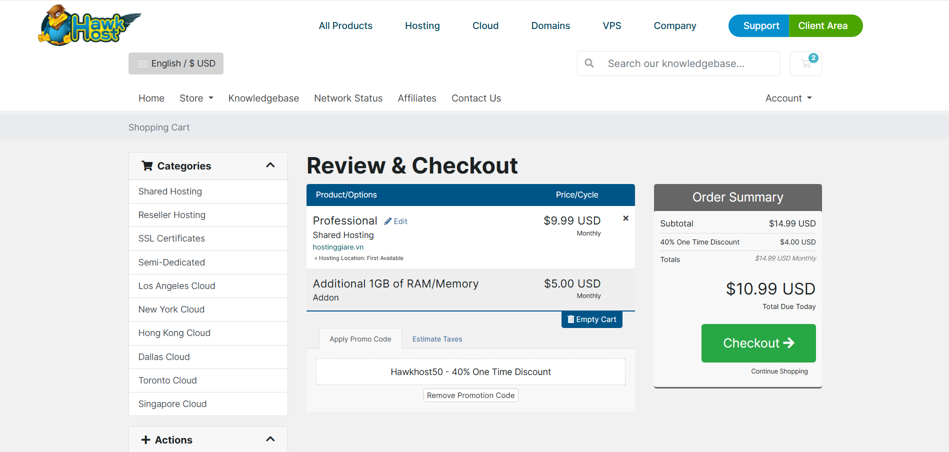 Rất có thể Hawk Host sẽ tự động áp dụng một mã giảm giá mặc định. Để sử dụng mã bạn tìm được, hãy tìm và nhấn vào nút “Remove Promotion Code” (hoặc tương tự) ở phía dưới trang thanh toán để xóa mã cũ đi.