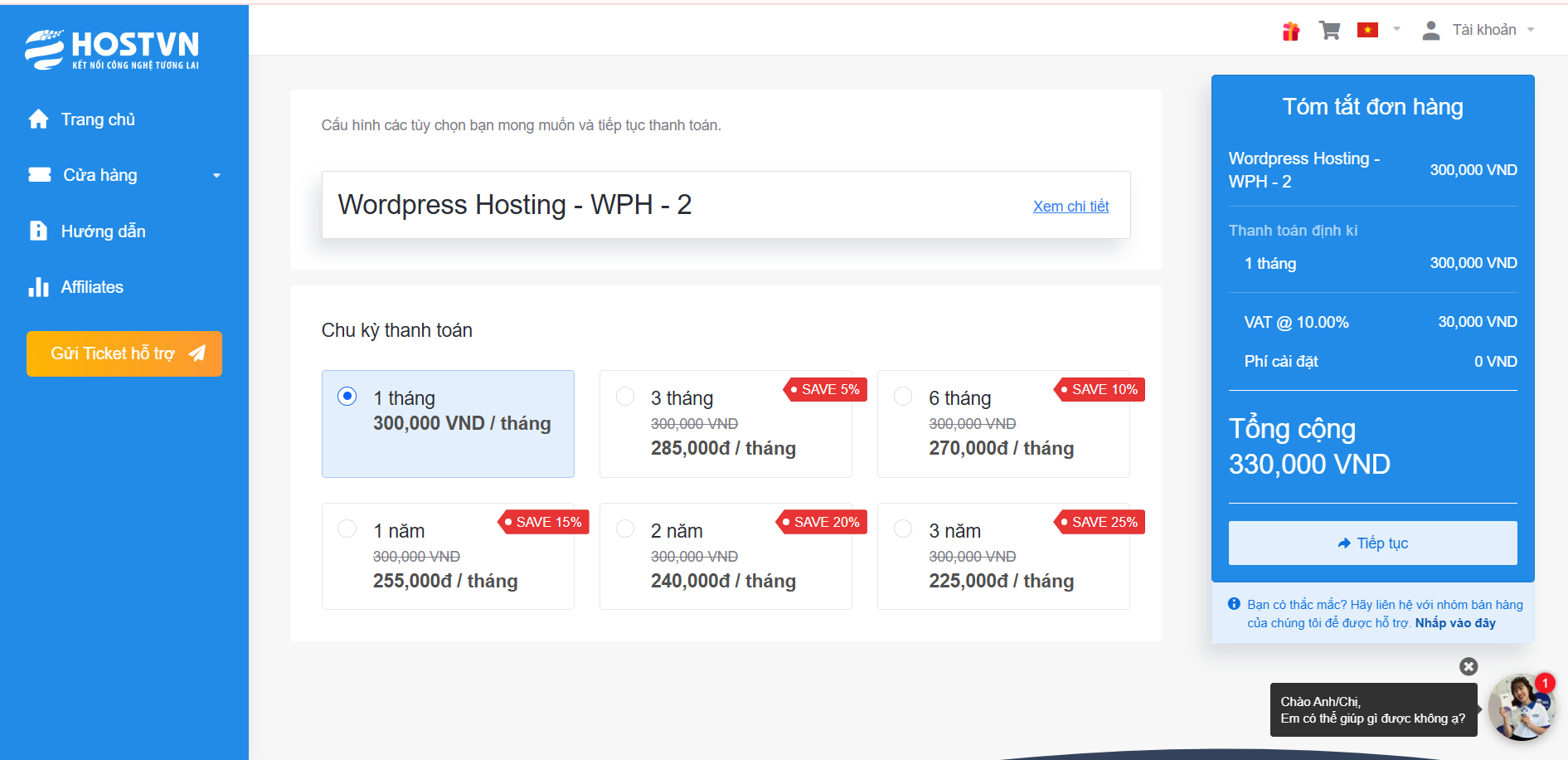 Đầu tiên, bạn truy cập vào trang dịch vụ của HostVN (Hosting, VPS, Email…), chọn gói dịch vụ phù hợp và chọn chu kỳ thanh toán. Lưu ý rằng hầu hết các mã giảm giá chỉ áp dụng cho chu kỳ từ 12 tháng trở lên.