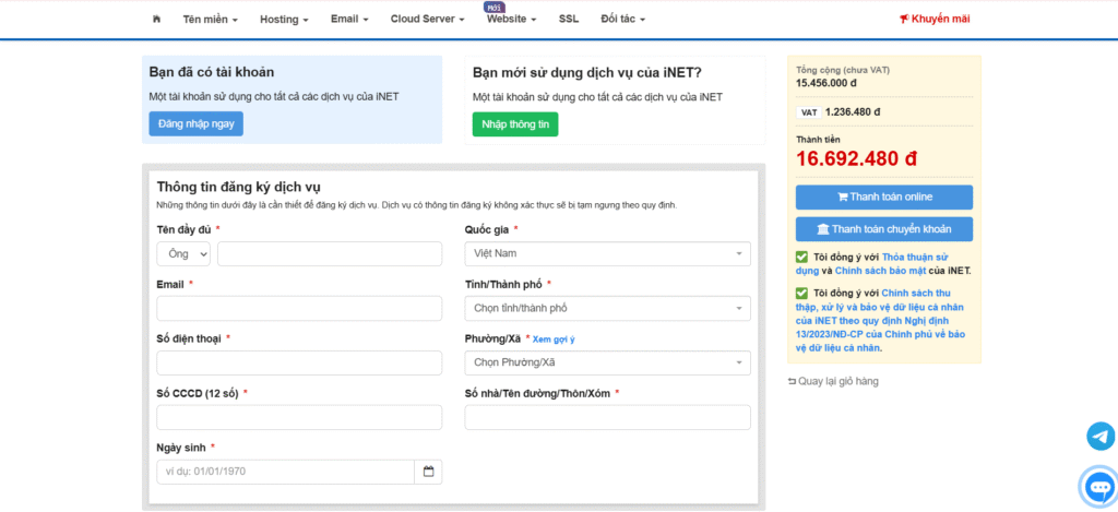 Đầu tiên, hãy truy cập trang chủ của iNET và tìm đến dịch vụ bạn muốn đăng ký, ví dụ như Hosting, VPS, Tên miền hoặc Email.