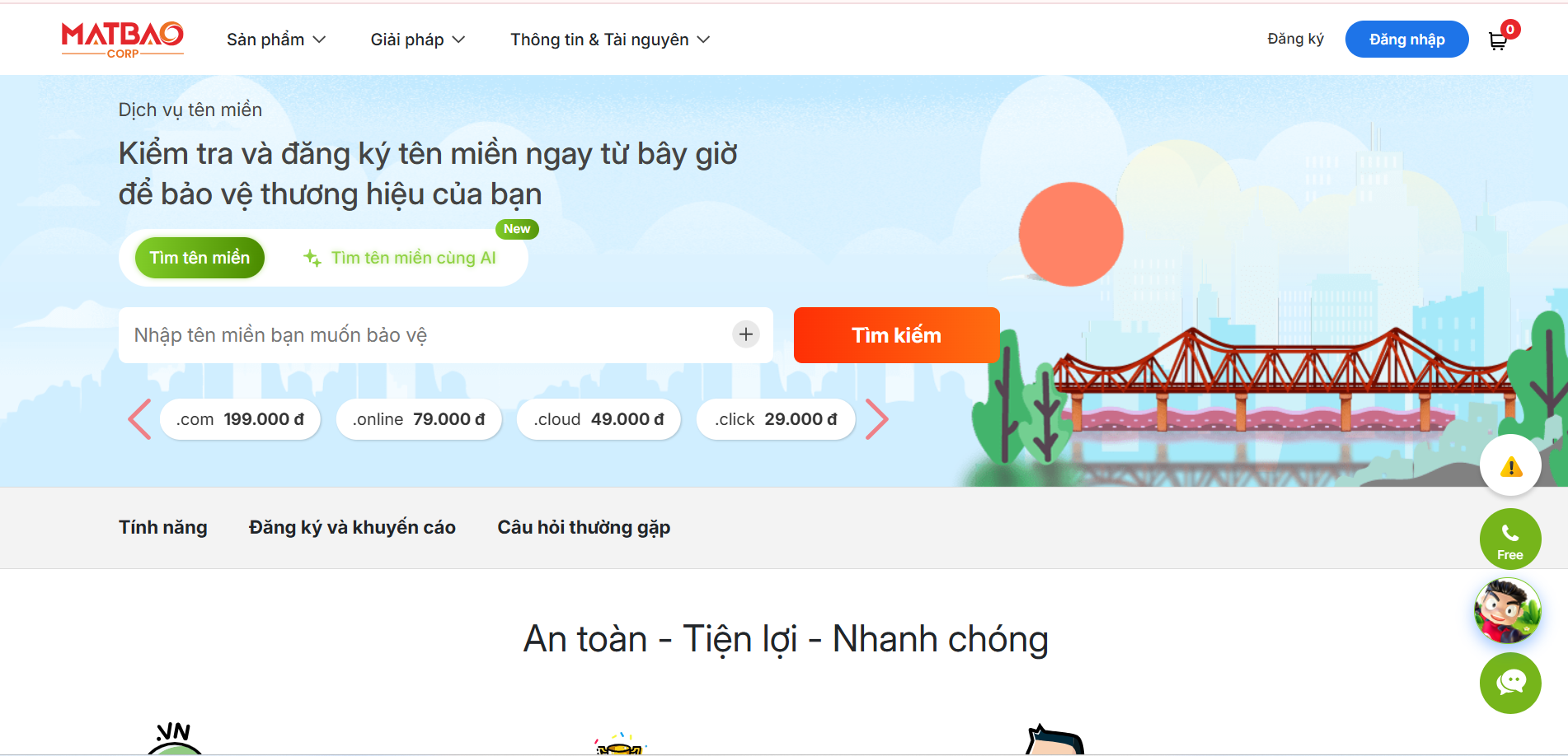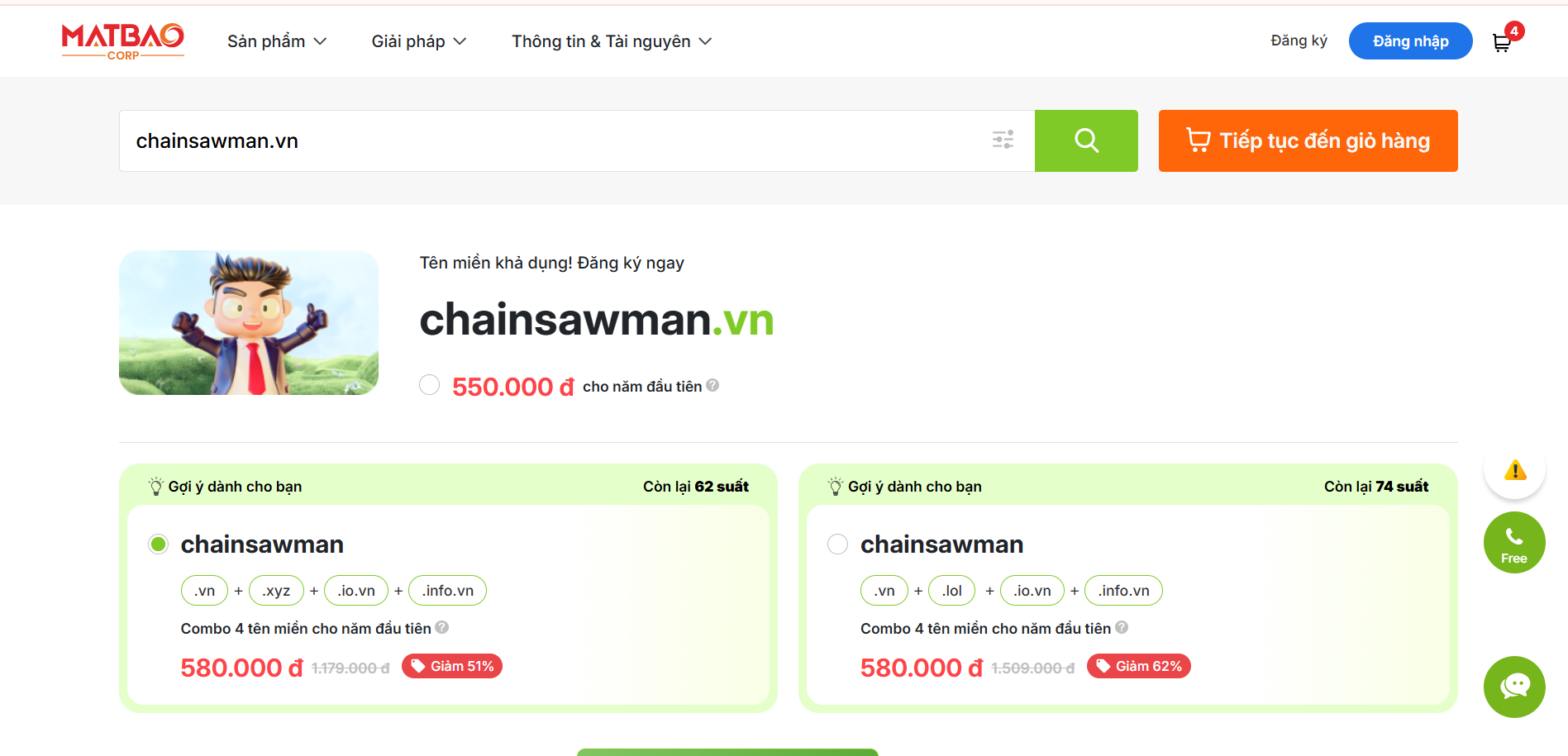 Đầu tiên, bạn truy cập trang chủ Mắt Bão và chọn dịch vụ muốn đăng ký. Ví dụ, trong trường hợp này, tôi sẽ chọn đăng ký một tên miền .COM để áp dụng voucher giảm 150.000đ.
