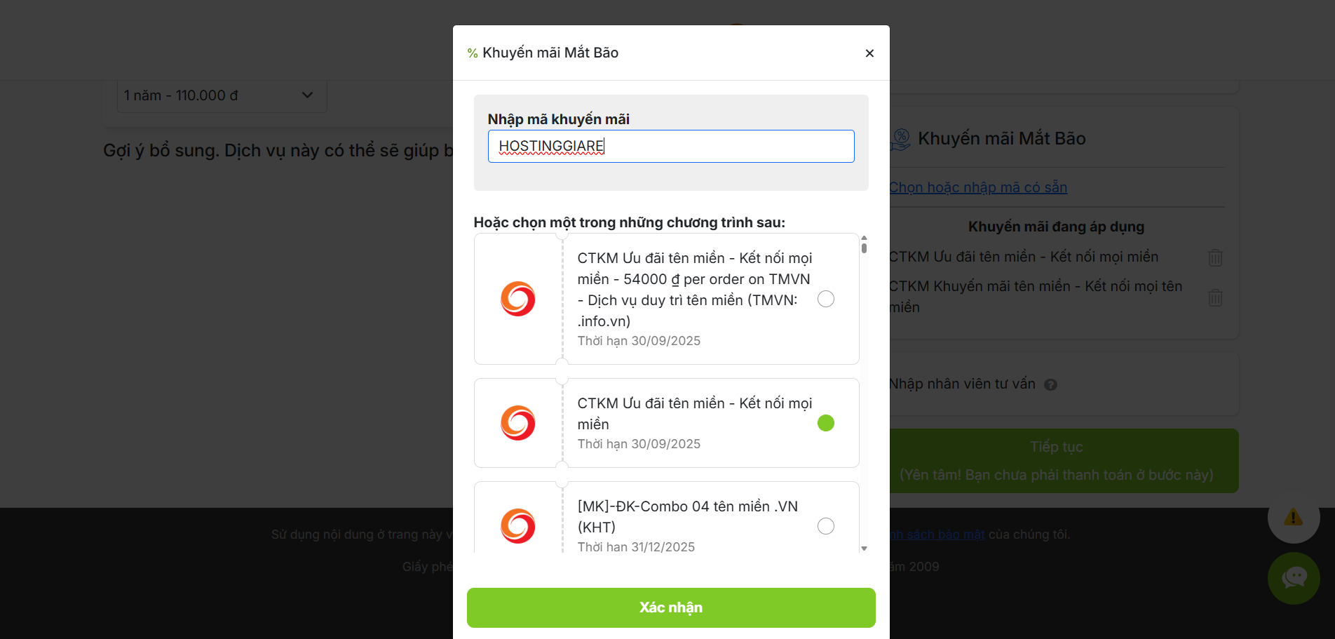 Một cửa sổ nhỏ sẽ hiện ra. Bạn hãy sao chép mã voucher đã nhận qua email và dán vào ô trống, sau đó nhấn nút “Xác nhận”. Hệ thống sẽ ngay lập tức kiểm tra và áp dụng mã. Bạn sẽ thấy giá của dịch vụ được giảm trừ tương ứng, ví dụ như tên miền .COM từ 249.000đ giảm còn 99.000đ.
