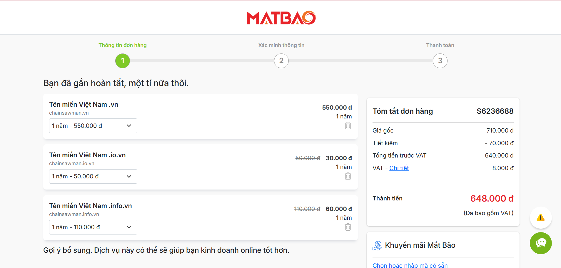 Sau khi thêm dịch vụ vào giỏ hàng, hệ thống sẽ đưa bạn đến trang tóm tắt đơn hàng. Tại đây, bạn hãy chú ý đến mục “Khuyến mãi Mắt Bão”. Ngay bên dưới là một dòng chữ có thể nhấp vào: “Chọn hoặc nhập mã có sẵn”. Đây chính là vị trí bạn cần thao tác.