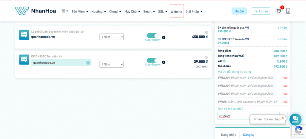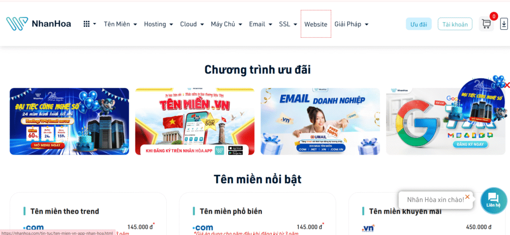 Đầu tiên, bạn truy cập vào website chính thức của Nhân Hòa và tìm đến dịch vụ mình cần đăng ký, ví dụ như Tên miền, Hosting hay VPS. Hãy chọn gói dịch vụ có cấu hình phù hợp với nhu cầu của bạn.