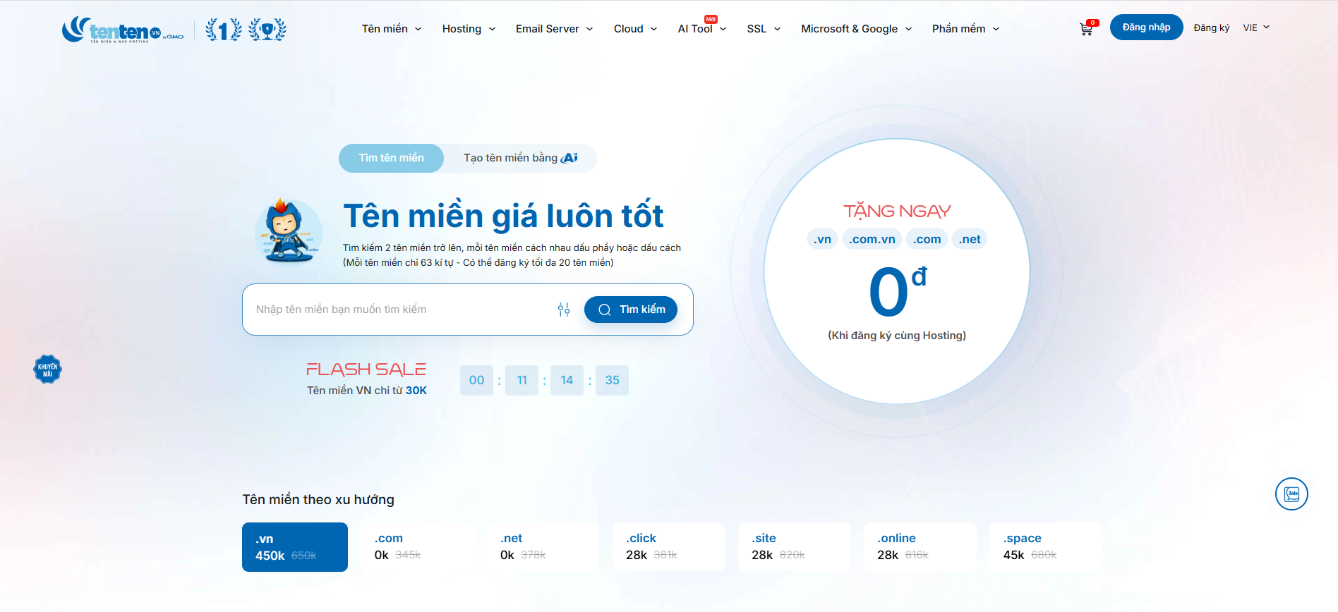 - Ưu đãi: Giảm 200.000đ khi mua tên miền .VN, tặng kèm tên miền .shop chỉ 0đ và Email Pro giảm 99%.