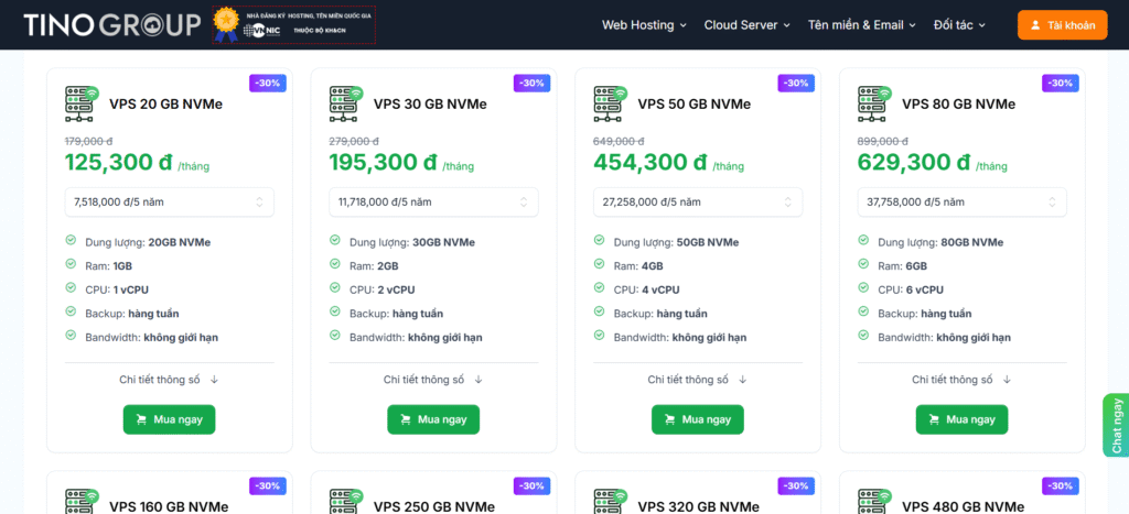 • VPS 30GB NVMe (Từ 195.300đ/tháng): Với 2 vCPU và 2GB RAM, gói này là lựa chọn phổ biến nhất, đủ sức chạy một website WordPress lớn hoặc nhiều website nhỏ.