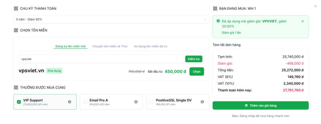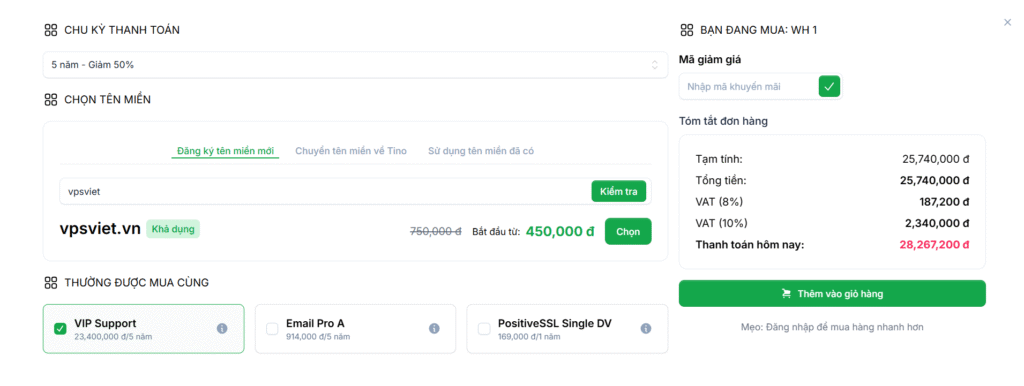 Sau khi chọn dịch vụ, hãy xem xét các gói có sẵn. Mỗi gói sẽ có thông số kỹ thuật và mức giá khác nhau. Một lời khuyên từ kinh nghiệm của tôi là nên ưu tiên các chu kỳ thanh toán dài hạn như 1 năm hoặc 2 năm, vì bạn không chỉ được hưởng mức giá tốt hơn mà còn áp dụng được mã giảm giá trên tổng giá trị lớn hơn.