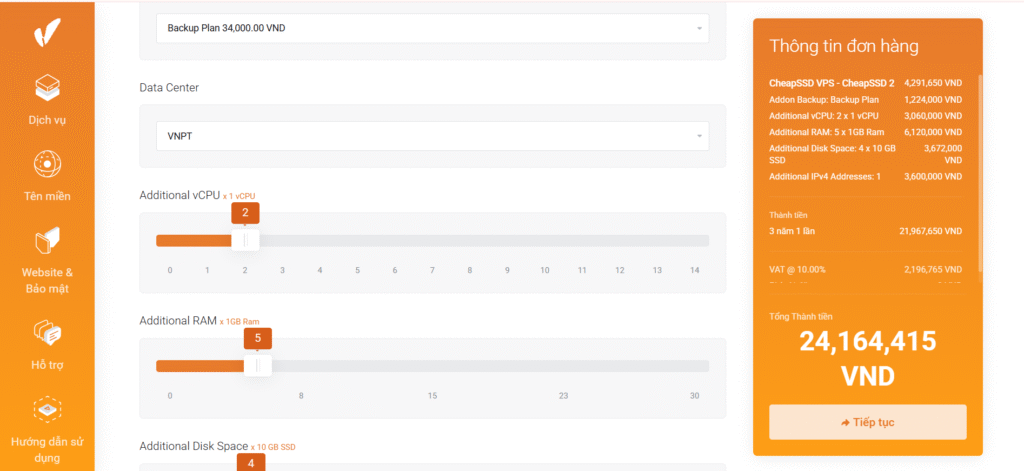 Sau khi chọn gói, bạn sẽ được chuyển đến bước cấu hình thêm như chọn thời hạn đăng ký và tên miền (nếu cần). Khi đã hoàn tất lựa chọn, bạn hãy nhấn “Tiếp tục” để hệ thống đưa bạn đến trang giỏ hàng. Tại đây, hãy kiểm tra lại một lần nữa thông tin gói dịch vụ và thời hạn đã chọn.