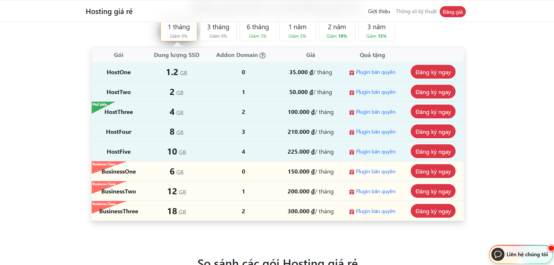 • HostThree (phổ biến nhất): 100.000đ/tháng (4GB SSD, 2 addon domain)