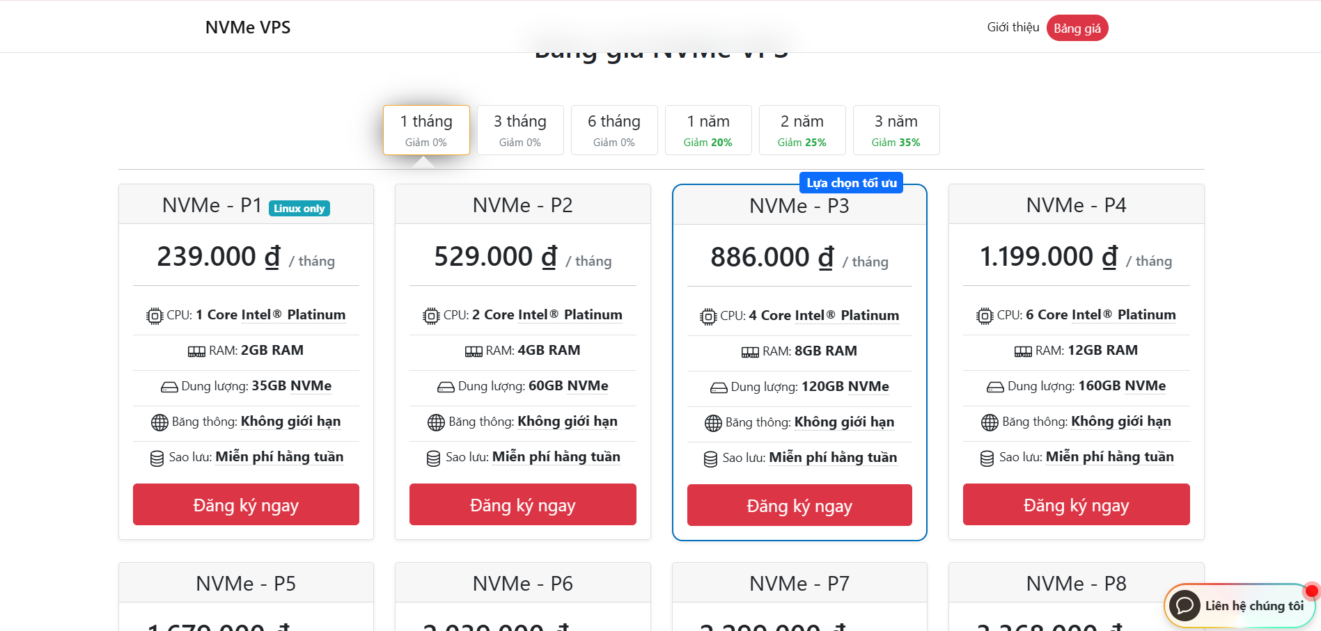 Bảng giá tham khảo cho NVMe VPS siêu tốc dao động từ 239.000đ/tháng cho các cấu hình cơ bản đến 2.500.000đ/tháng cho các cấu hình cao cấp nhất, phù hợp với nhiều quy mô doanh nghiệp.