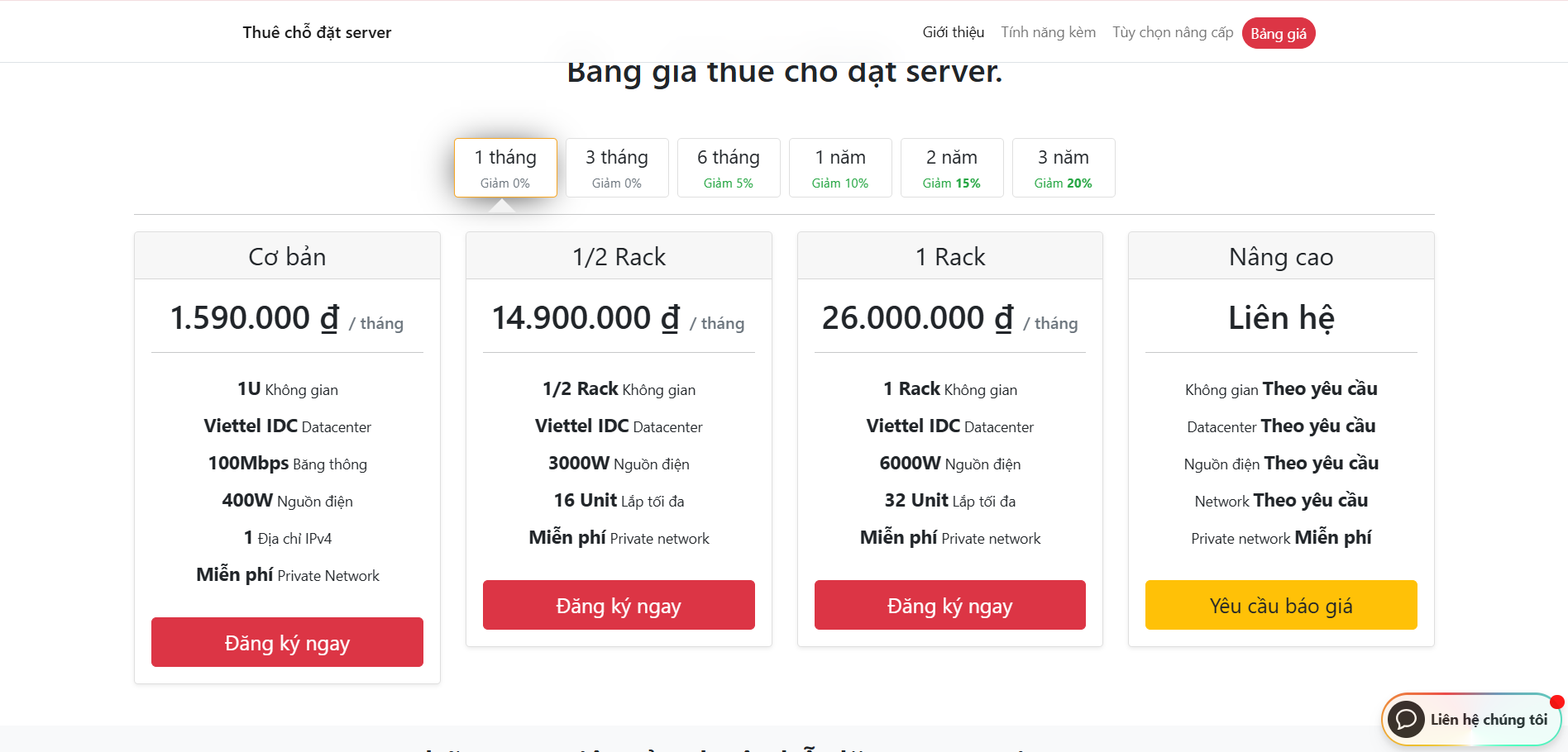 Các gói dịch vụ bao gồm từ 1U cơ bản (1.590.000đ/tháng) đến các tùy chọn 1/2 rack hoặc 1 rack cho các hệ thống lớn, với các thông số về băng thông, nguồn điện có thể tùy chỉnh theo yêu cầu. Khách hàng sử dụng dịch vụ Colocation sẽ được hưởng lợi từ Private Network miễn phí, hỗ trợ IPKVM và quyền ra vào datacenter 24/7.