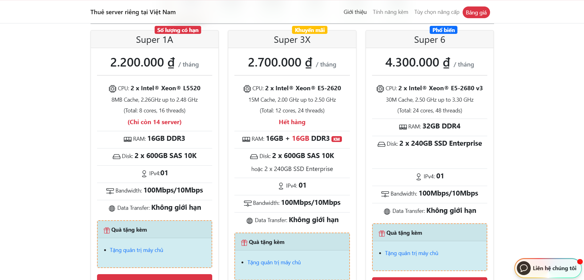 Các gói dịch vụ như Super 1A (CPU 2 x Intel Xeon L5520), Super 6 (CPU 2 x Intel Xeon E5-2680 v3) và Super 8 (CPU 2 x Intel Xeon E5-2683 v4) với cấu hình RAM và dung lượng ổ cứng đa dạng, đáp ứng mọi yêu cầu từ website nhỏ đến các hệ thống tải cực cao. Một điểm cộng lớn là 123HOST tặng kèm dịch vụ quản trị miễn phí, bao gồm cài đặt, tối ưu hệ điều hành, giám sát từ xa 24/7 và hỗ trợ xử lý sự cố, giúp doanh nghiệp tiết kiệm chi phí thuê nhân sự quản trị riêng.