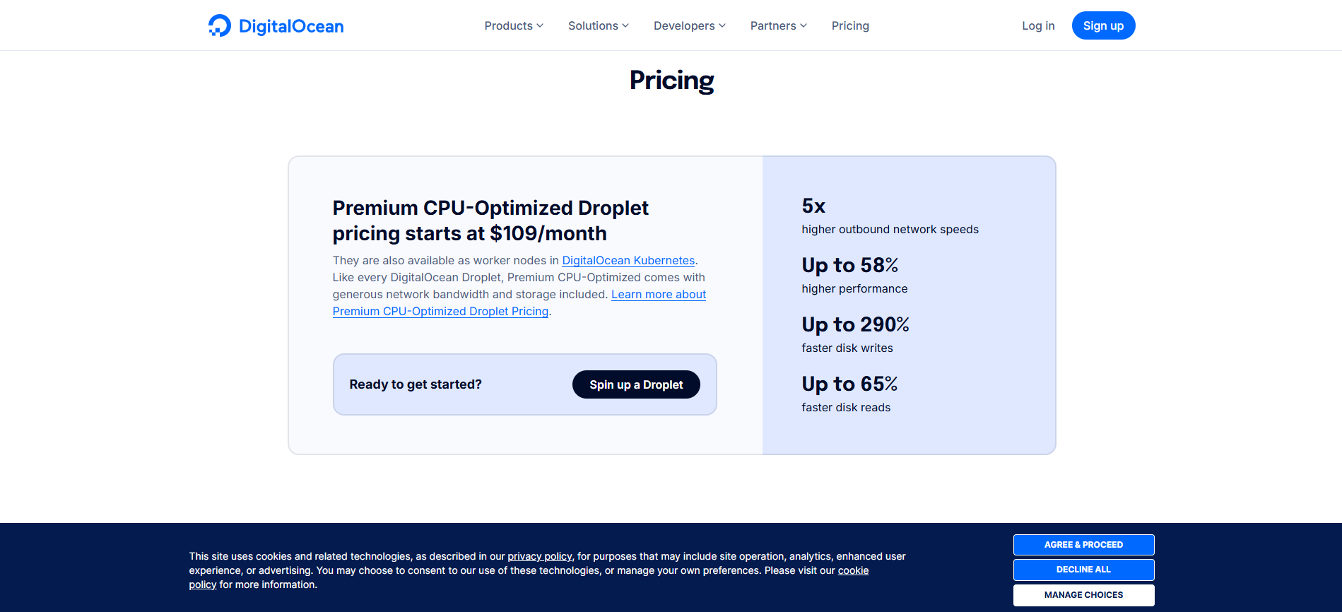 - Hiệu năng vượt trội: Nhờ sử dụng CPU Intel Xeon/AMD EPYC thế hệ mới và ổ cứng SSD NVMe Enterprise, các dịch vụ của DigitalOcean mang lại hiệu suất mạnh mẽ và ổn định.