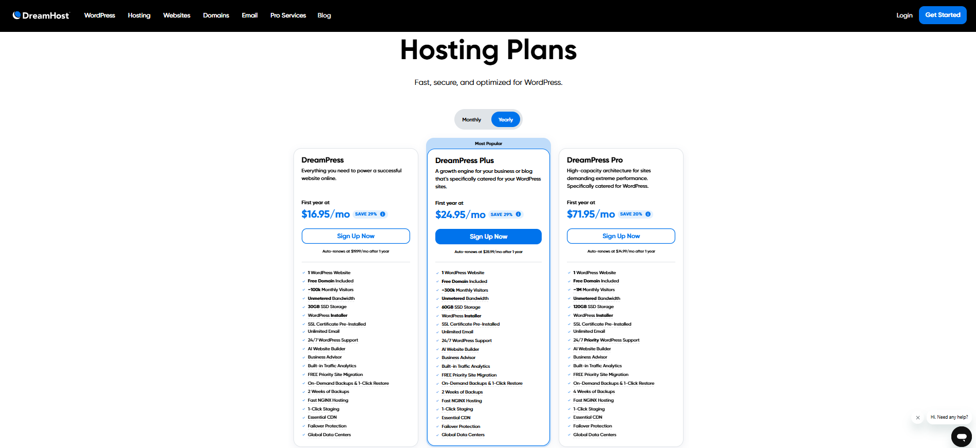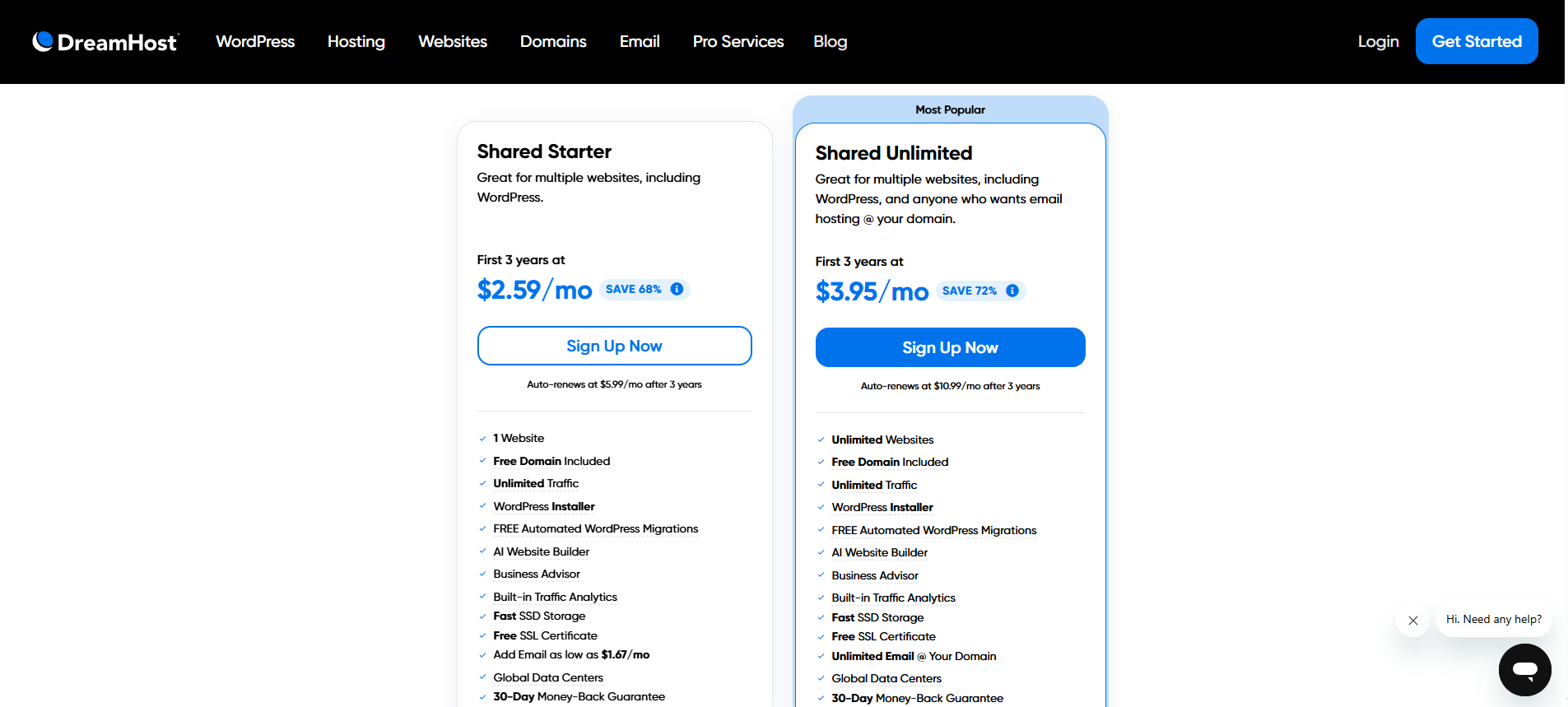 Tổng quan, mức giá, đối tượng phù hợp: DreamHost cung cấp gói Shared Hosting với mức giá cực kỳ cạnh tranh, bắt đầu chỉ từ 2.95/tháng khi cam kết một năm (theo PCMag). Gói này lý tưởng cho các blogger, cá nhân, startup nhỏ hoặc các website có lượng truy cập vừa phải.