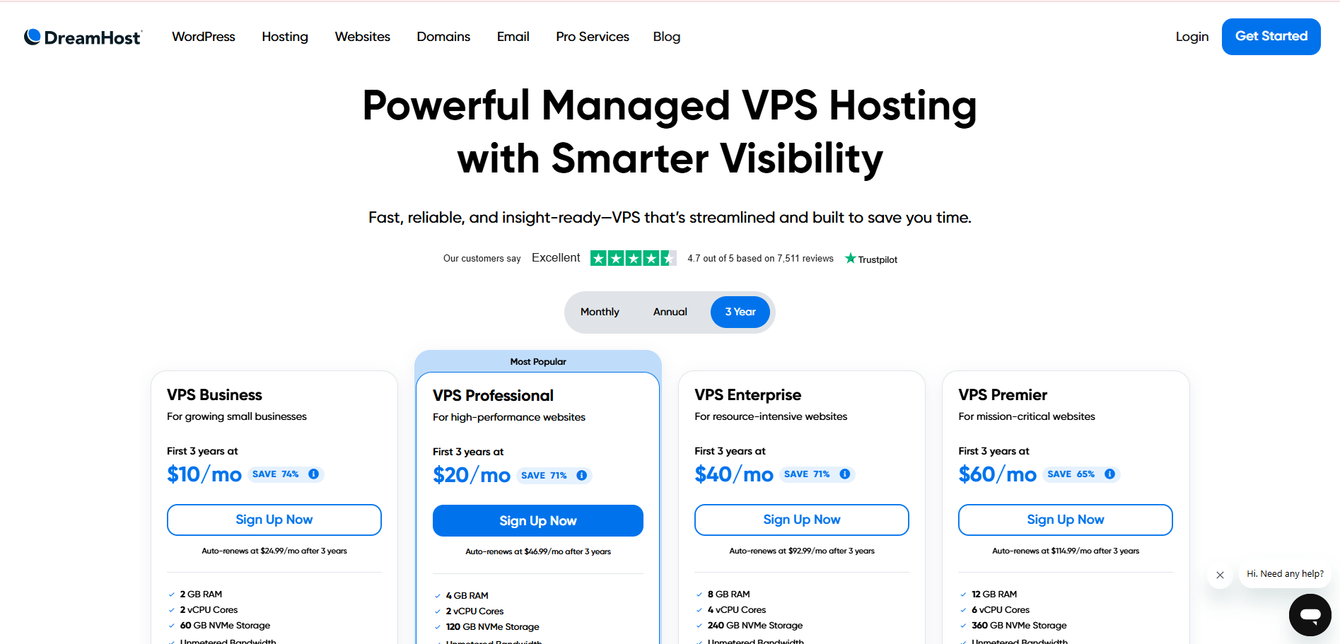 Tổng quan, mức giá, đối tượng phù hợp: DreamHost cung cấp các gói VPS Hosting với mức giá khởi điểm khoảng 13.75/tháng khi cam kết một năm (theo PCMag). Các gói này nhắm đến các website có lượng truy cập trung bình, các ứng dụng yêu cầu tài nguyên riêng biệt hoặc các doanh nghiệp nhỏ cần sự ổn định cao hơn.
