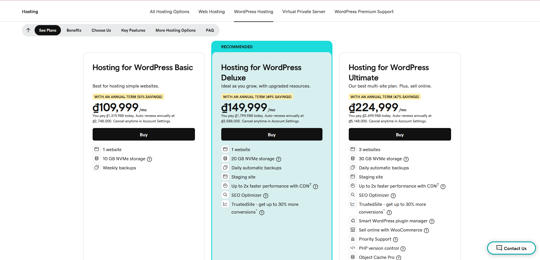 Các tính năng đặc thù: Gói này được thiết kế riêng để mang lại hiệu suất tốt nhất cho các trang web WordPress. Các tính năng nổi bật bao gồm: dung lượng lưu trữ NVMe lên đến 30GB, miễn phí chứng chỉ SSL, tích hợp CDN để tăng tốc độ tải trang toàn cầu, sao lưu hàng ngày và tự động khôi phục, công cụ SEO tích hợp, tường lửa (WAF) và chống DDoS. Một điểm cộng lớn là việc cung cấp môi trường staging, cho phép bạn thử nghiệm các thay đổi, cập nhật hoặc thiết kế trên một bản sao của website trước khi áp dụng lên phiên bản chính thức, giúp đảm bảo sự ổn định và tránh rủi ro.