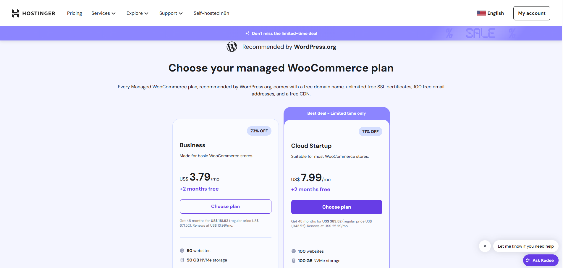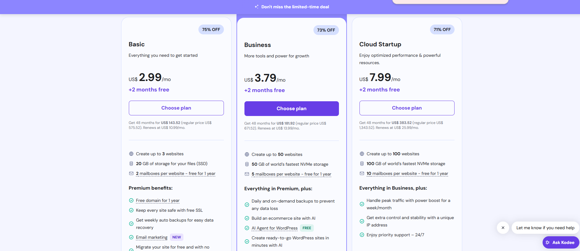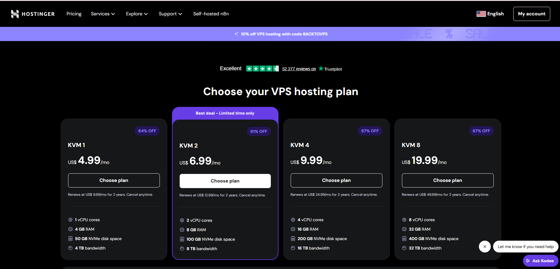 Trợ lý AI Kodee: Được giới thiệu vào tháng 9 năm 2024, Kodee là một trợ lý chat AI có sẵn trong tất cả các gói của Hostinger. Tôi đã có cơ hội thử nghiệm Kodee và nhận thấy nó đã cải thiện đáng kể.
