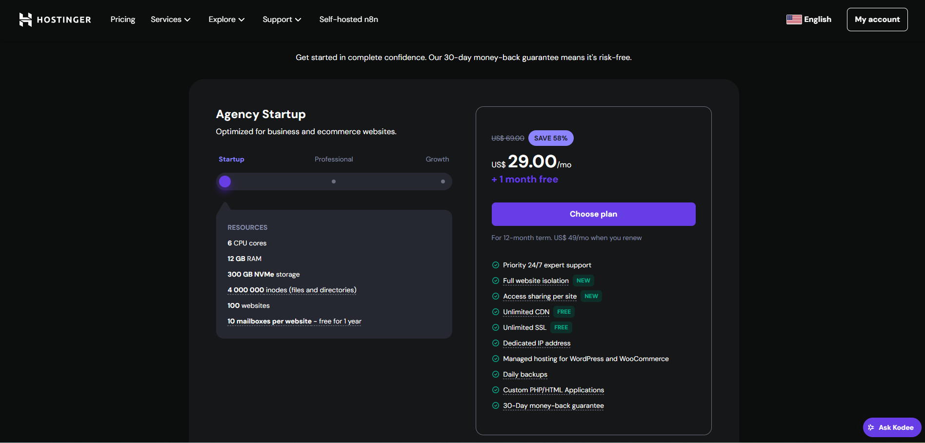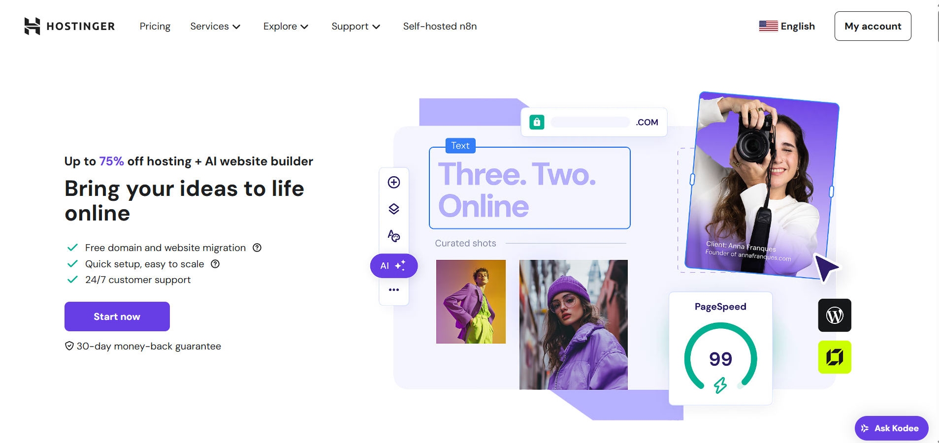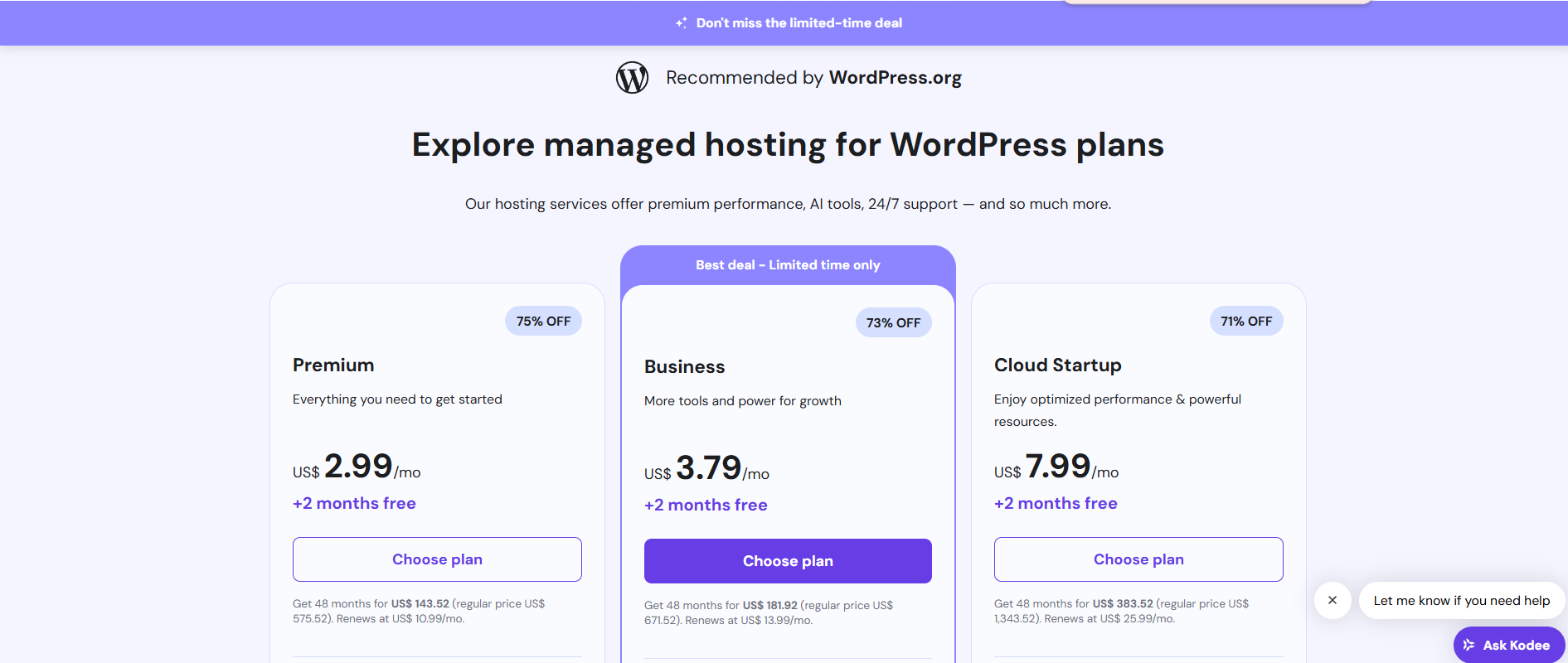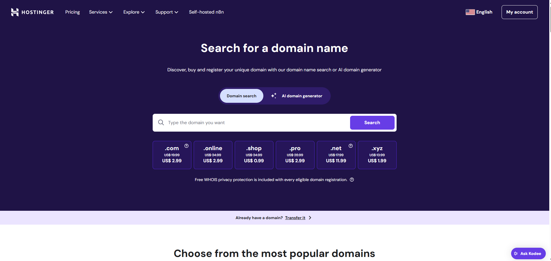 Trợ lý AI Kodee: Được giới thiệu vào tháng 9 năm 2024, Kodee là một trợ lý chat AI có sẵn trong tất cả các gói của Hostinger. Tôi đã có cơ hội thử nghiệm Kodee và nhận thấy nó đã cải thiện đáng kể.