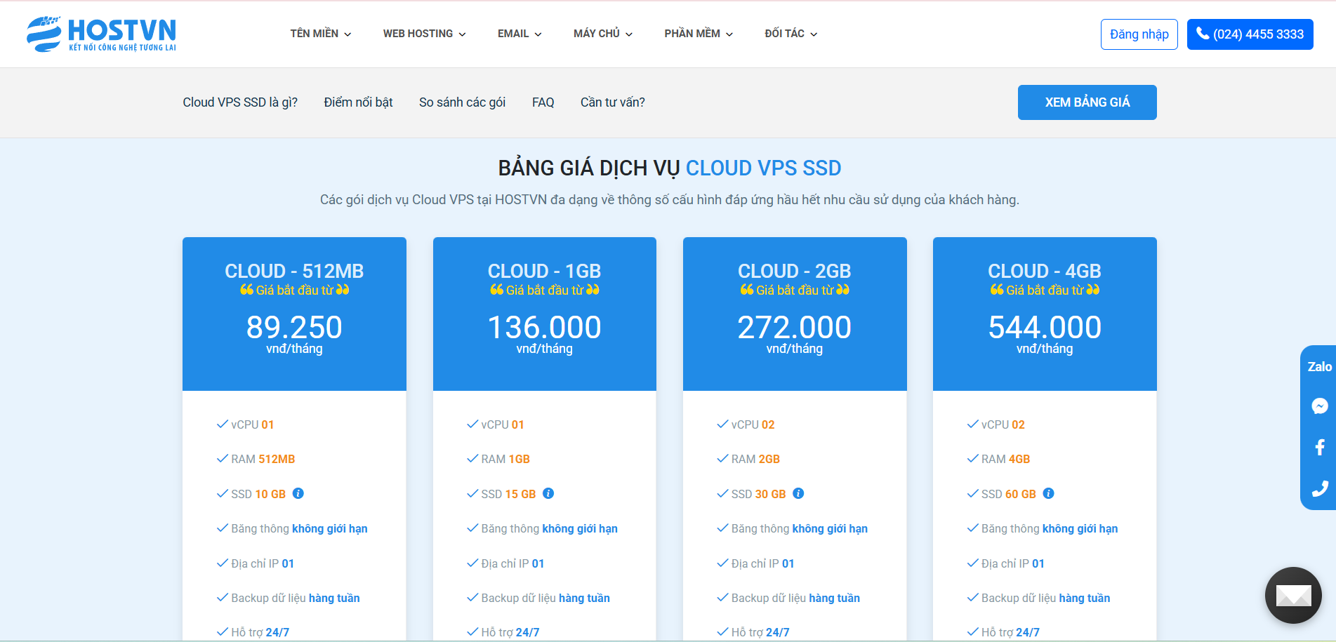- Cloud VPS SSD: Gói rẻ nhất là 125.000 VNĐ/tháng (512MB RAM, 1 core CPU, 10GB SSD, băng thông không giới hạn). Mức giá này được đánh giá là “kha khá cao” so với các nhà cung cấp khác tại Việt Nam.