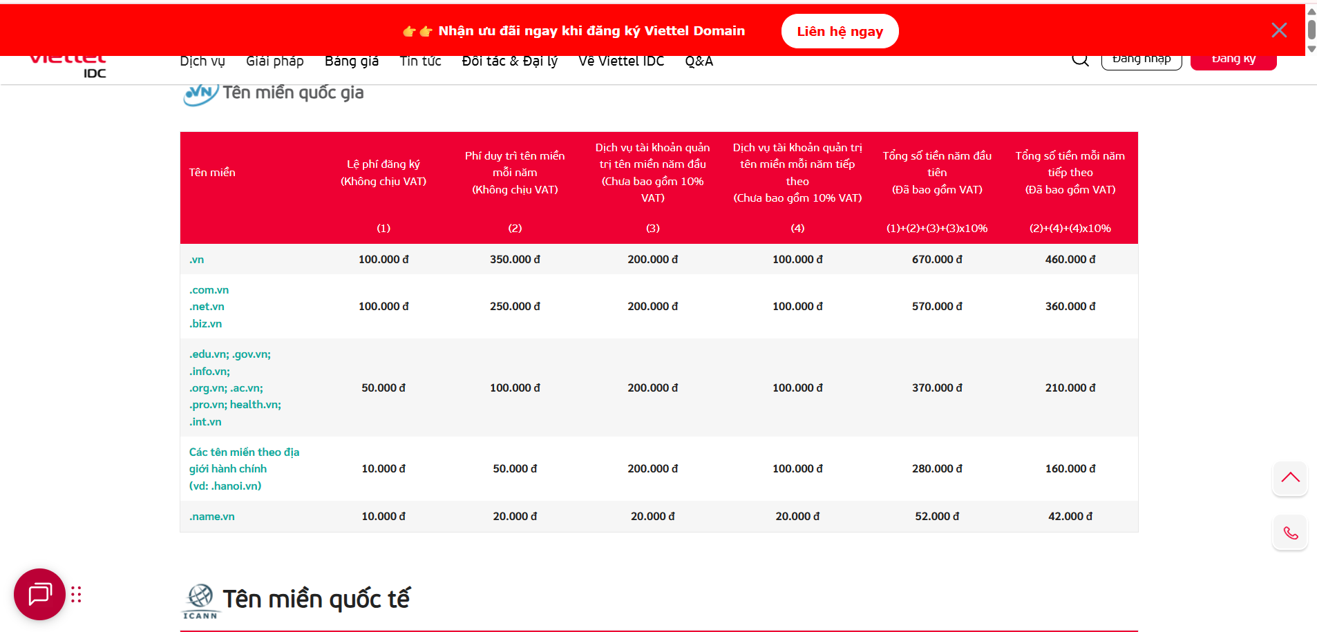 - Viettel Domain (Tên miền quốc gia, quốc tế): Viettel IDC hỗ trợ đăng ký cả tên miền quốc gia (.vn) và tên miền quốc tế (.com, .net, .org…). Tên miền là địa chỉ duy nhất của website trên internet, là yếu tố đầu tiên giúp khách hàng tìm thấy và ghi nhớ thương hiệu của bạn. Việc có một nhà cung cấp uy tín như Viettel IDC trong việc quản lý tên miền sẽ giúp bạn an tâm về tính ổn định và bảo mật.