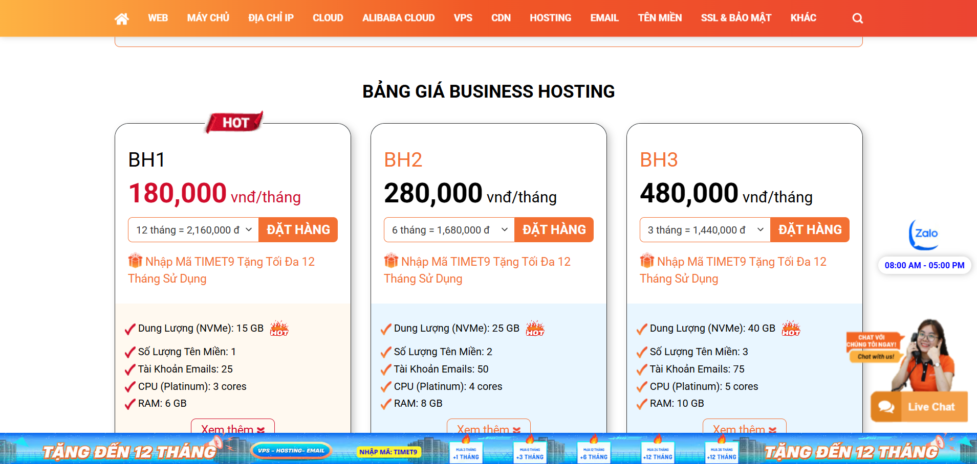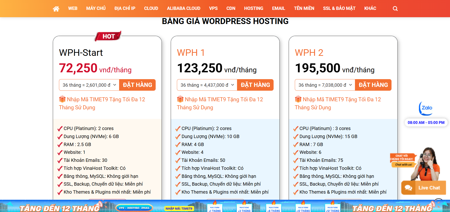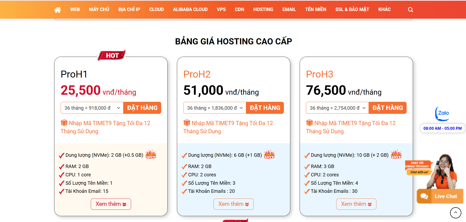 VinahostHạ tầng phần cứng mạnh (Server DELL, SSD NVMe, mạng 10Gbps); đa dạng dịch vụ từ hosting giá rẻ đến Private Cloud; cam kết uptime 99.9%; backup miễn phíHosting, Private Cloud, VPS, máy chủMáy chủ DELL, SSD NVMe, mạng 10Gbps, datacenter trong nướcHỗ trợ 24/7 chuyên nghiệp, song ngữGiá cạnh tranh với chất lượng caoCân bằng giữa chất lượng và giá; tối ưu tốc độ truy cập trong nước