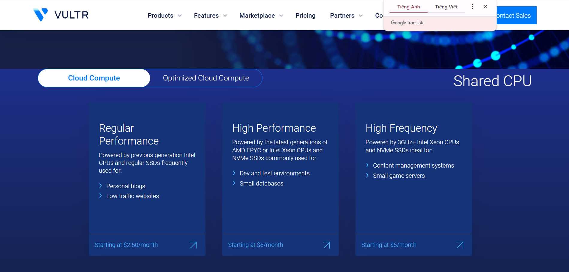 • Tổng quan: Cung cấp cấu hình linh hoạt từ 1 vCPU – 8 vCPU và RAM từ 1GB – 32GB. Vultr đảm bảo tốc độ ổn định và uptime SLA 99,99%.