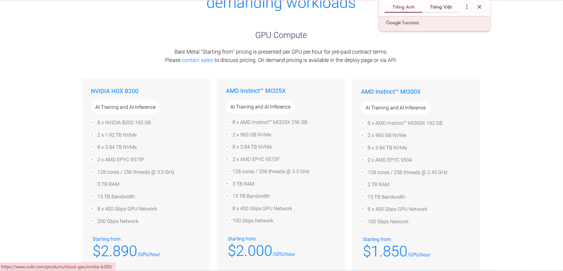 • Đối tượng phù hợp: Doanh nghiệp lớn, các dự án AI/ML (Trí tuệ nhân tạo/Học máy), Big Data, Game Server, Streaming hoặc ứng dụng SaaS quy mô lớn.
