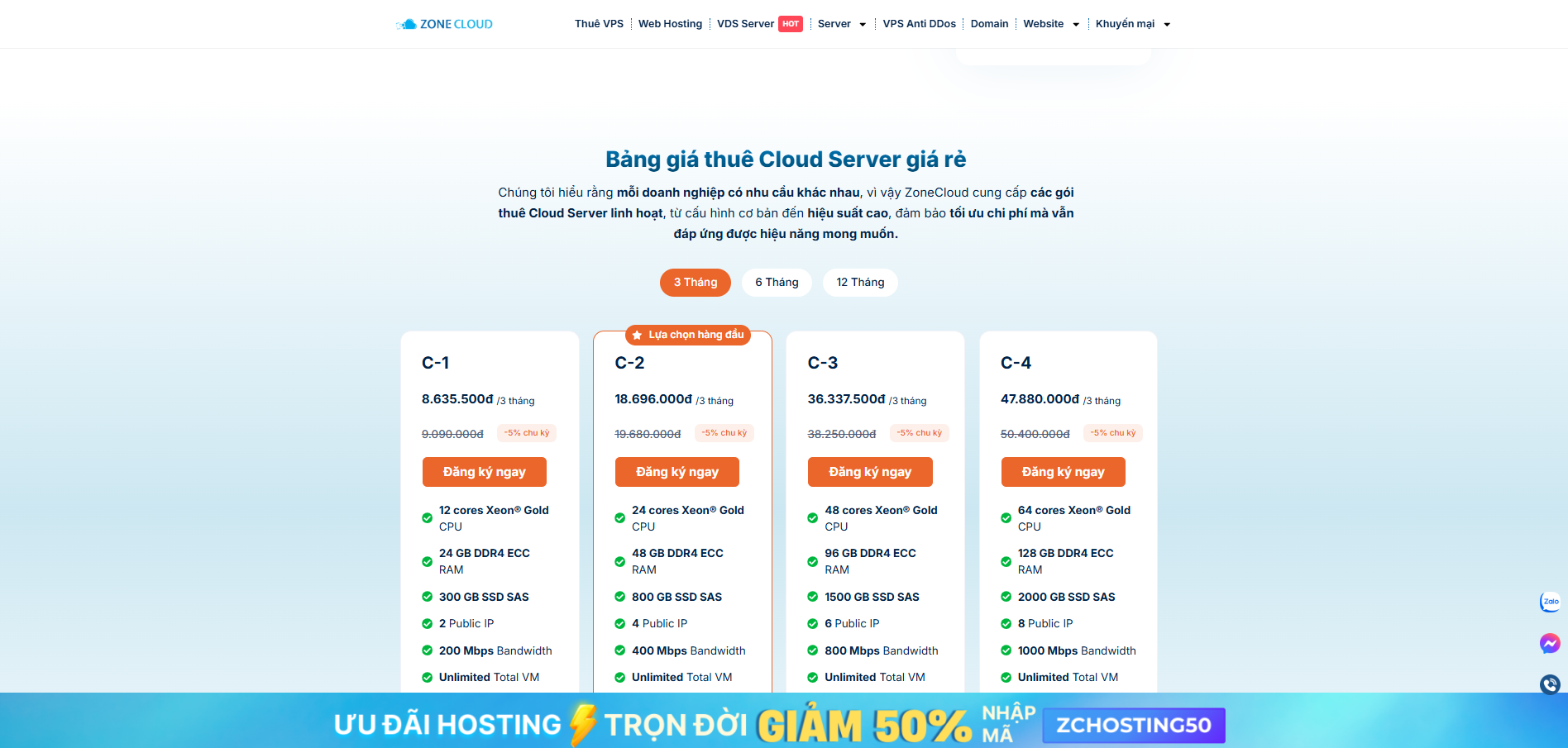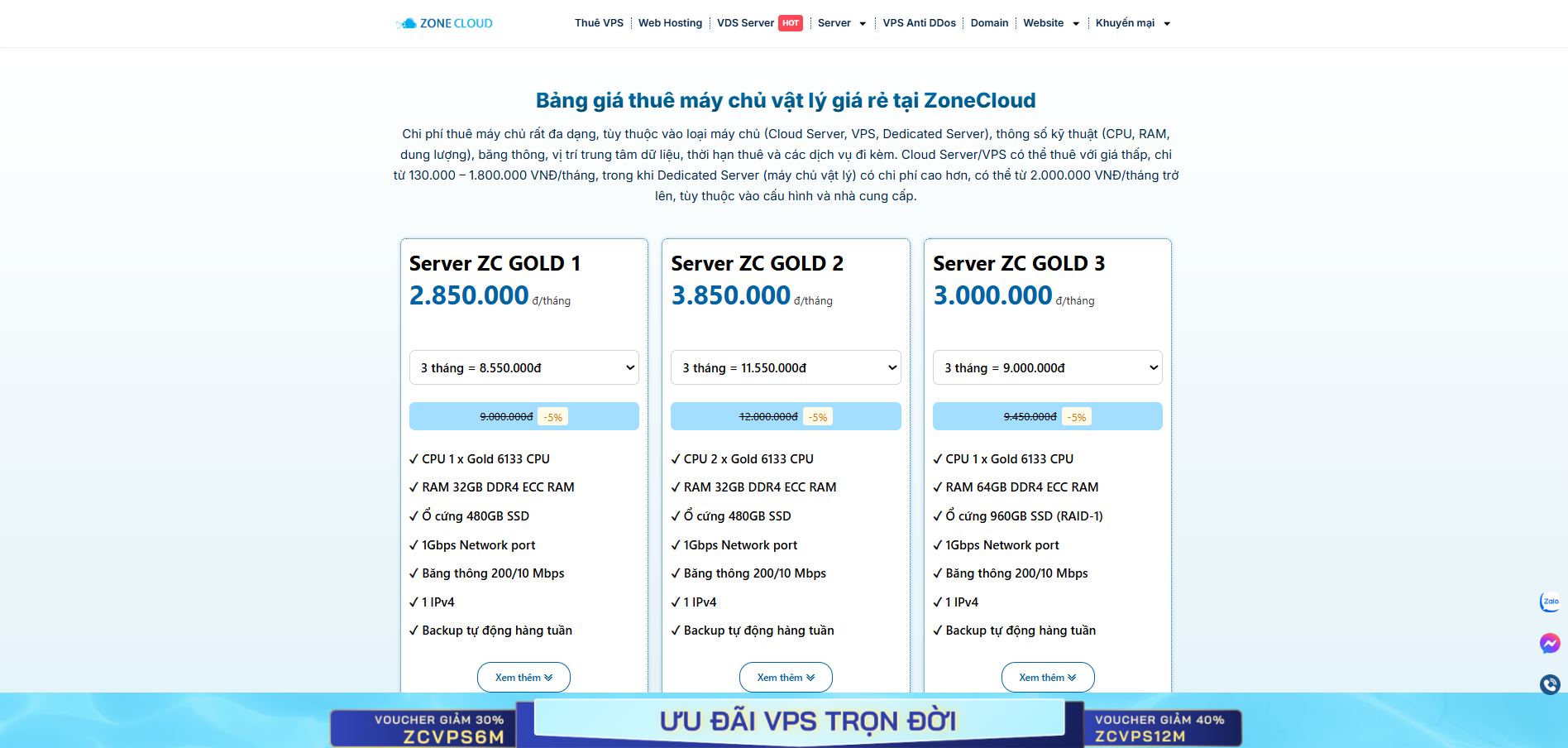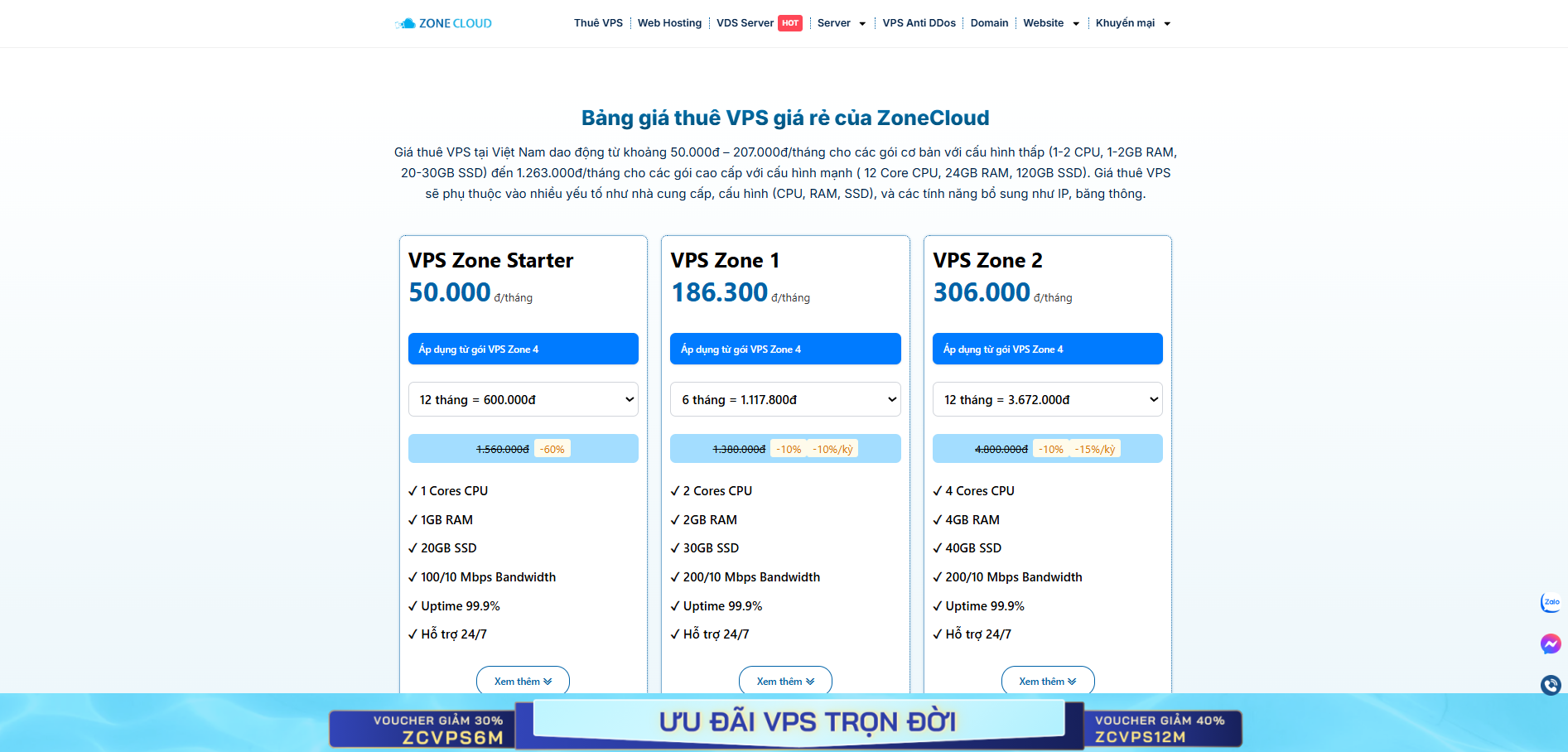 - Giá cạnh tranh và nhiều ưu đãi: ZoneCloud cung cấp các gói dịch vụ với mức giá hợp lý, dễ tiếp cận, đặc biệt là các gói Hosting và VPS cơ bản. Bên cạnh đó, họ thường xuyên có các chương trình khuyến mãi, giảm giá theo chu kỳ thanh toán hoặc tặng thêm tài nguyên, giúp khách hàng tối ưu chi phí.